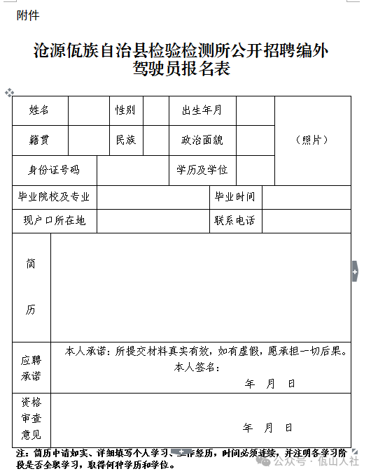附件:滄源佤族自治縣檢驗(yàn)檢測(cè)所公開招聘編外駕駛員報(bào)名表