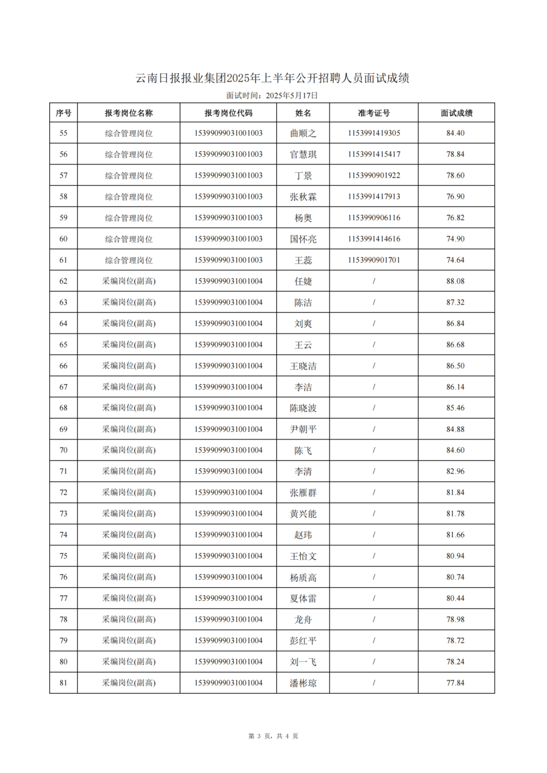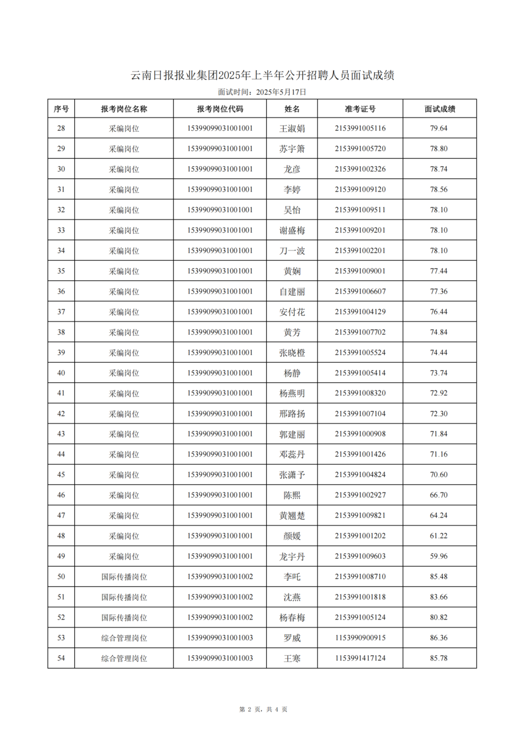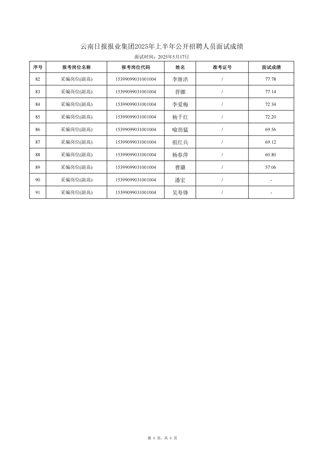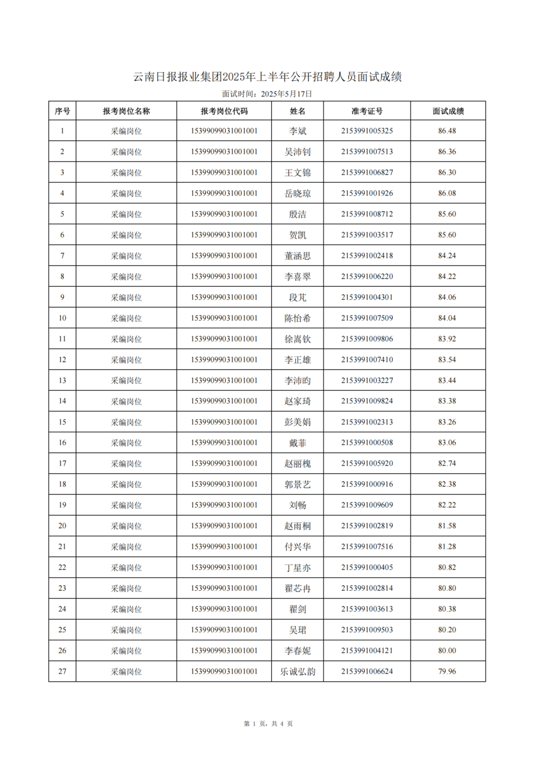 云南日報(bào)報(bào)業(yè)集團(tuán)2025年上半年公開招聘人員面試成績公告