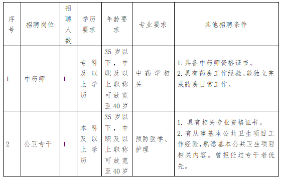 此次面向社會(huì)公開招聘中藥師1名,公衛(wèi)專干1人,共計(jì)2人。