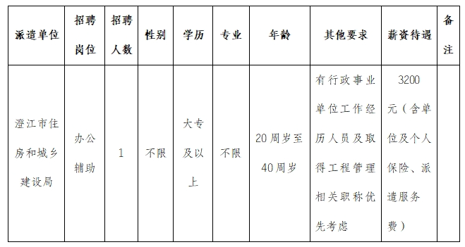 澄江市住房和城鄉(xiāng)建設(shè)局因工作需要,現(xiàn)委托澄江市啟澄人力資源有限責(zé)任公司,面向社會(huì)公開(kāi)招聘辦公輔助工作人員1名,現(xiàn)將有關(guān)事項(xiàng)公告如下: