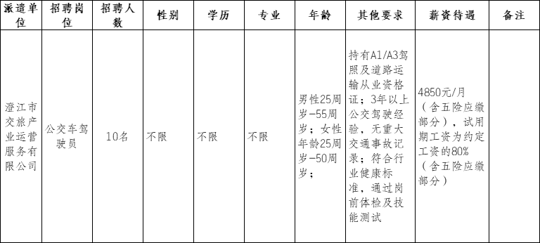 澄江市交旅產(chǎn)業(yè)運營服務(wù)有限公司因工作需要,委托澄江市啟澄人力資源有限責(zé)任公司,面向社會公開招聘公交車駕駛員10名,現(xiàn)將有關(guān)事項公告如下: