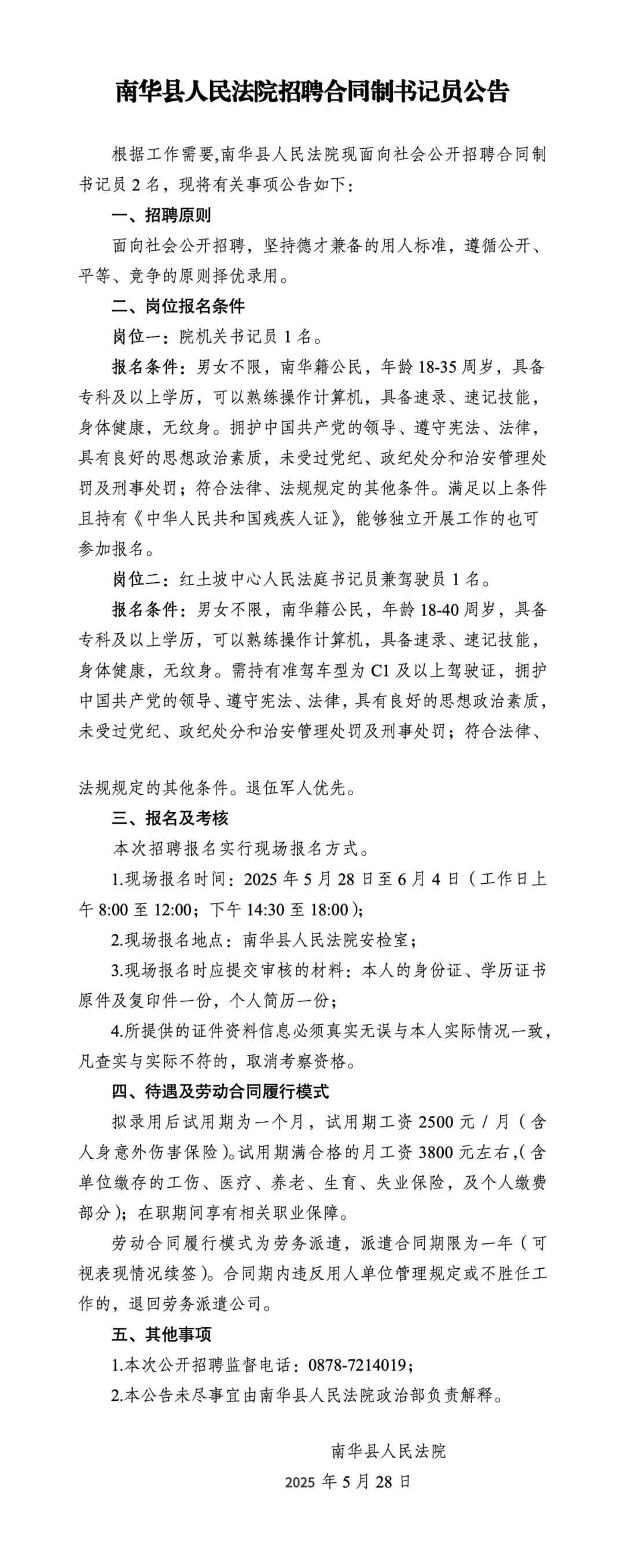 2025年楚雄州南華縣人民法院招聘合同制書記員公告