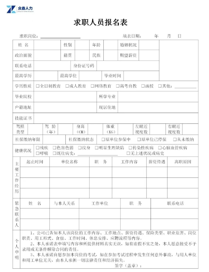 電子版《求職報名表》獲取方式:添加公司微信19995856427,獲取《求職報名表》。報名材料統(tǒng)一發(fā)送至微信19995856427。