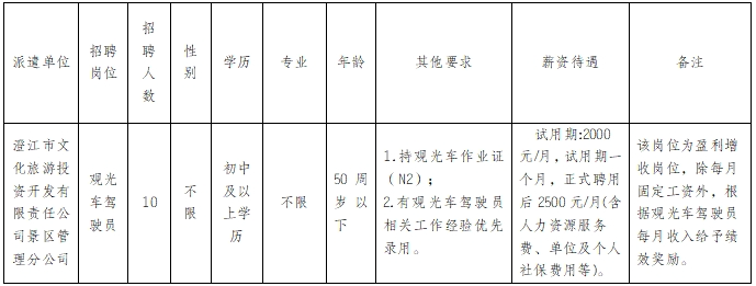 澄江市文化旅游投資開發(fā)有限責(zé)任公司景區(qū)管理分公司因工作需要,委托澄江市啟澄人力資源有限責(zé)任公司,面向社會公開招聘觀光車駕駛員10名,現(xiàn)將有關(guān)事項(xiàng)公告如下: