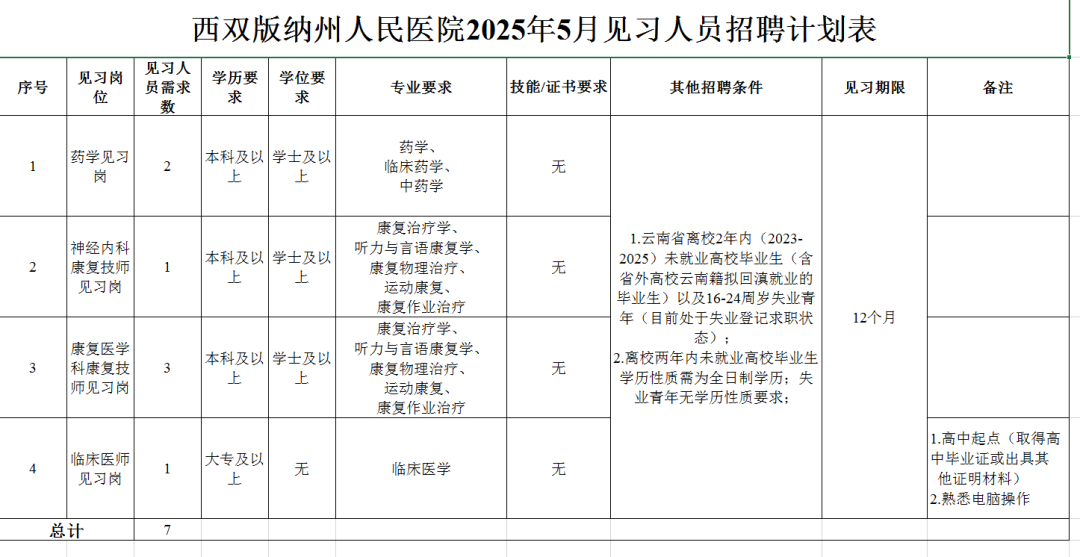 詳見《西雙版納州人民醫(yī)院2025年5月見習(xí)人員招聘計劃表》(附件1)。