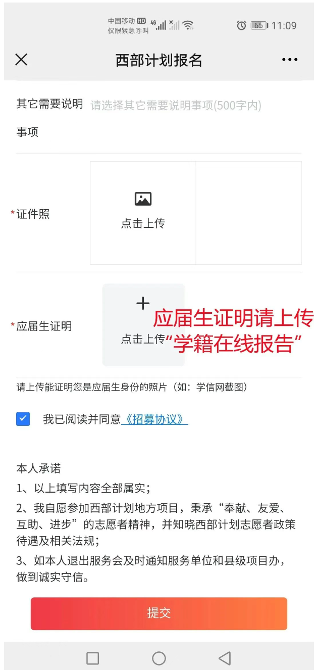 證件照上傳小一寸照片即可,勾選“我已閱讀并同意《招募協(xié)議》”,點(diǎn)擊提交即完成本次網(wǎng)絡(luò)報(bào)名。