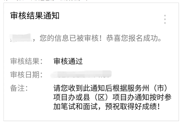 報(bào)名后,縣項(xiàng)目辦將登錄后臺(tái)進(jìn)行志愿者信息審核。審核通過(guò)后,志愿者將收到信息審核通過(guò)的微信模板消息。
