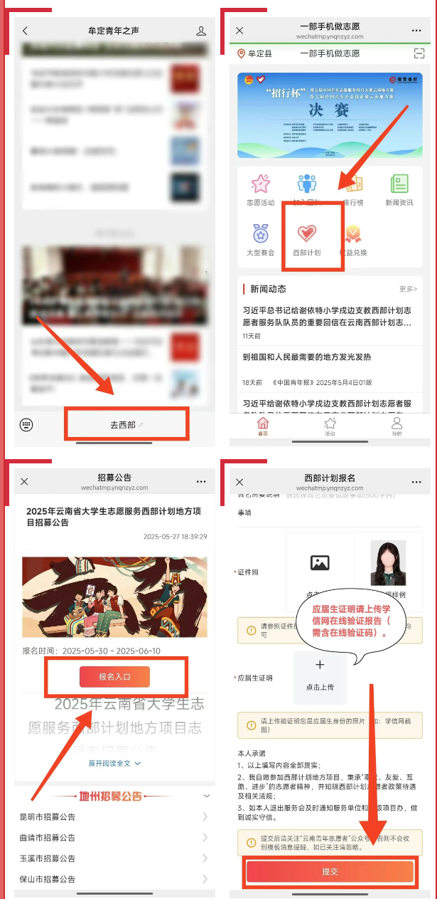 1.提交報(bào)名申請(qǐng)。本次招募采取網(wǎng)上報(bào)名。即日起至6月10日,報(bào)名人員關(guān)注微信公眾號(hào)“云南青年志愿者”“楚雄青年”及“牟定青年之聲”,有意愿參加西部計(jì)劃且符合招募條件的高校畢業(yè)生或在讀研究生先登錄西部計(jì)劃官網(wǎng)(http://xibu.youth.cn)報(bào)名,后點(diǎn)擊“一部手機(jī)做志愿”系統(tǒng)進(jìn)行注冊(cè)、填寫個(gè)人相關(guān)信息資料,填寫報(bào)名表并選擇意向服務(wù)縣——牟定縣,提交報(bào)名申請(qǐng)。報(bào)名時(shí)在網(wǎng)上所提交的申請(qǐng)材料必須真實(shí)、準(zhǔn)確,因網(wǎng)上報(bào)名提交的申請(qǐng)材料不真實(shí)、不完整或者錯(cuò)誤填寫報(bào)名信息,造成網(wǎng)上資格審查、面試資格審查、考察不通過(guò)等后果,由報(bào)名人員自行承擔(dān)責(zé)任。請(qǐng)報(bào)考人員自行登錄有關(guān)網(wǎng)站、公眾號(hào)查詢獲取相關(guān)信息。