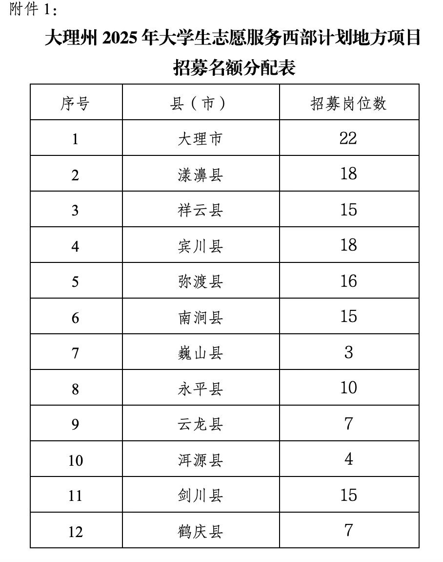 附件1:大理州2025年大學(xué)生志愿服務(wù)西部計劃地方項目招募名額分配表