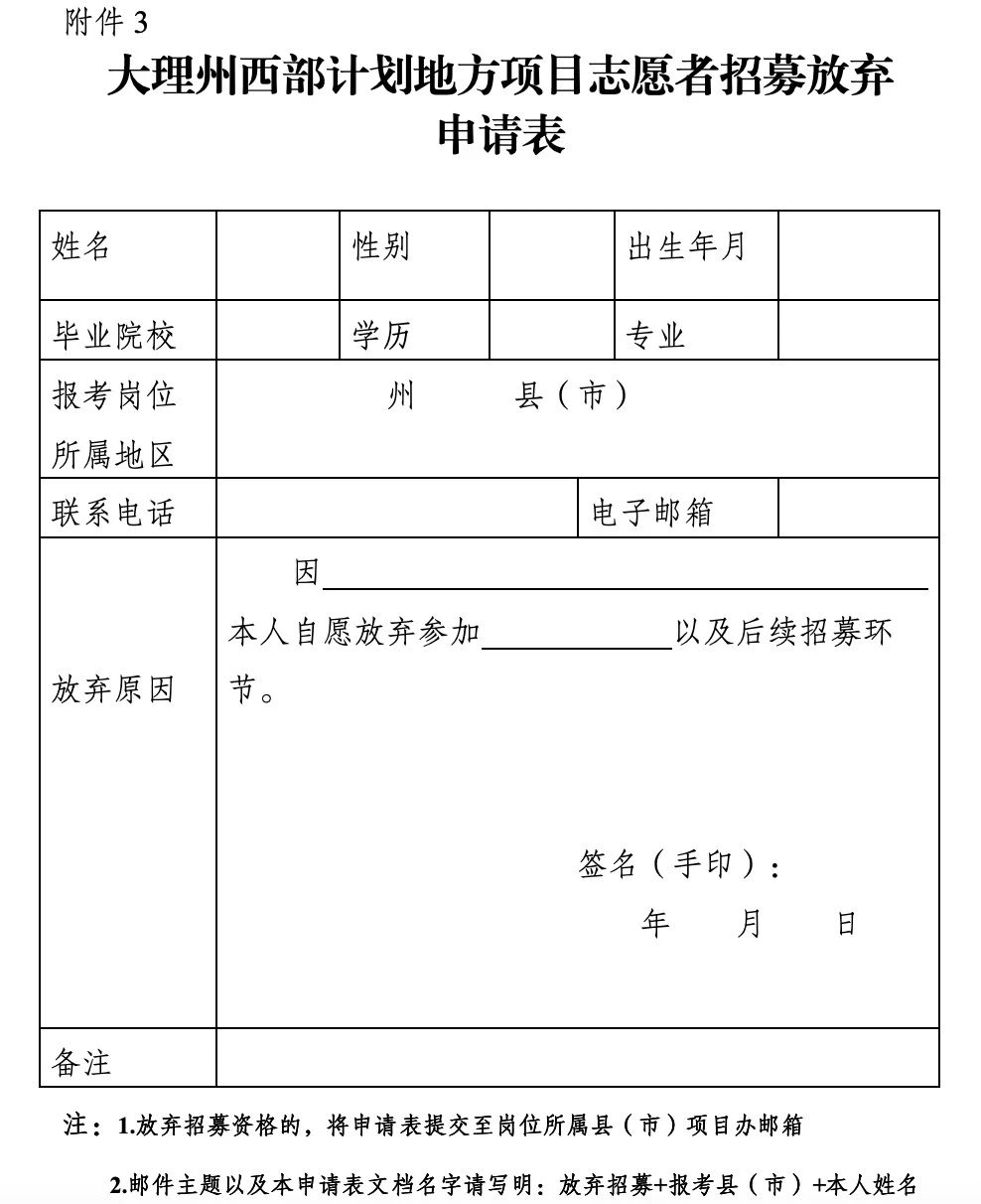 (三)請報考人員慎重決定是否報考,考試報名成功后,珍惜考試機(jī)會,不隨意浪費(fèi)考試資源;進(jìn)入體檢名單人員若放棄體檢、招募資格等,必須提前2天向所報考崗位的縣(市)項目辦提交《云南省西部計劃地方項目志愿者招募放棄申請表》(附件3)。