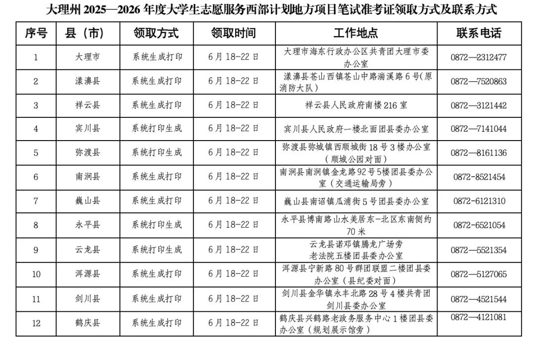 附件:大理州2025—2026年度大學(xué)生志愿服務(wù)西部計(jì)劃地方項(xiàng)目筆試準(zhǔn)考證領(lǐng)取方式及聯(lián)系方式