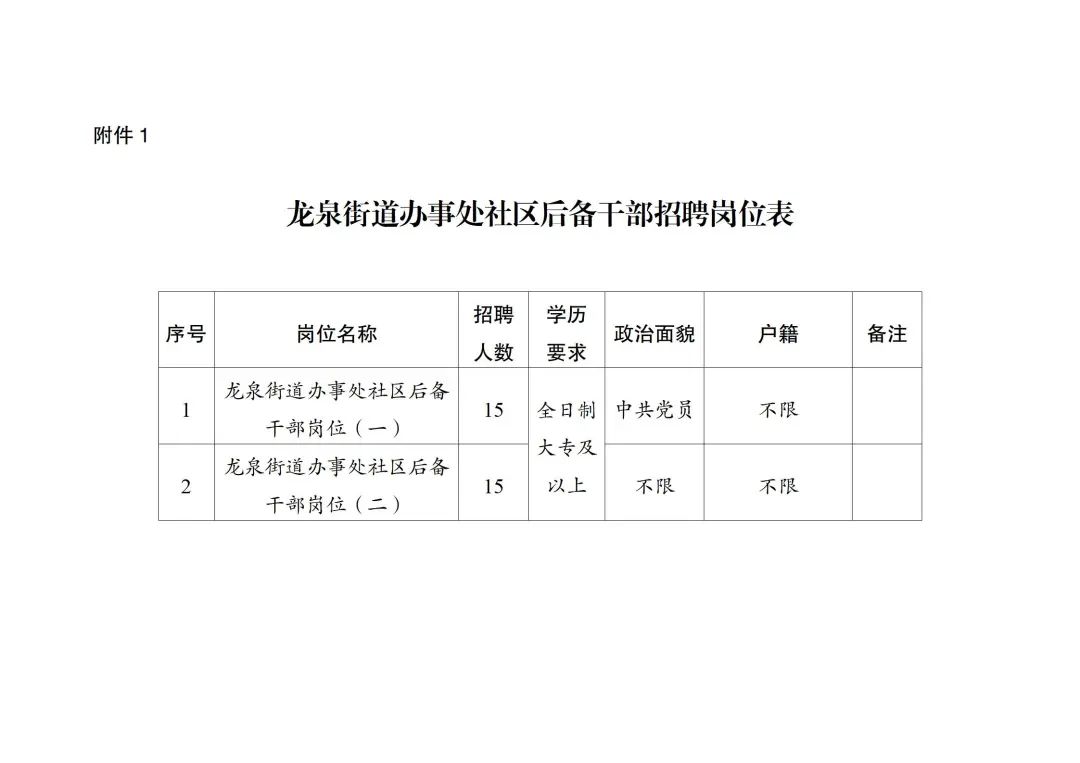 1.龍泉街道辦事處社區(qū)后備干部招聘崗位表