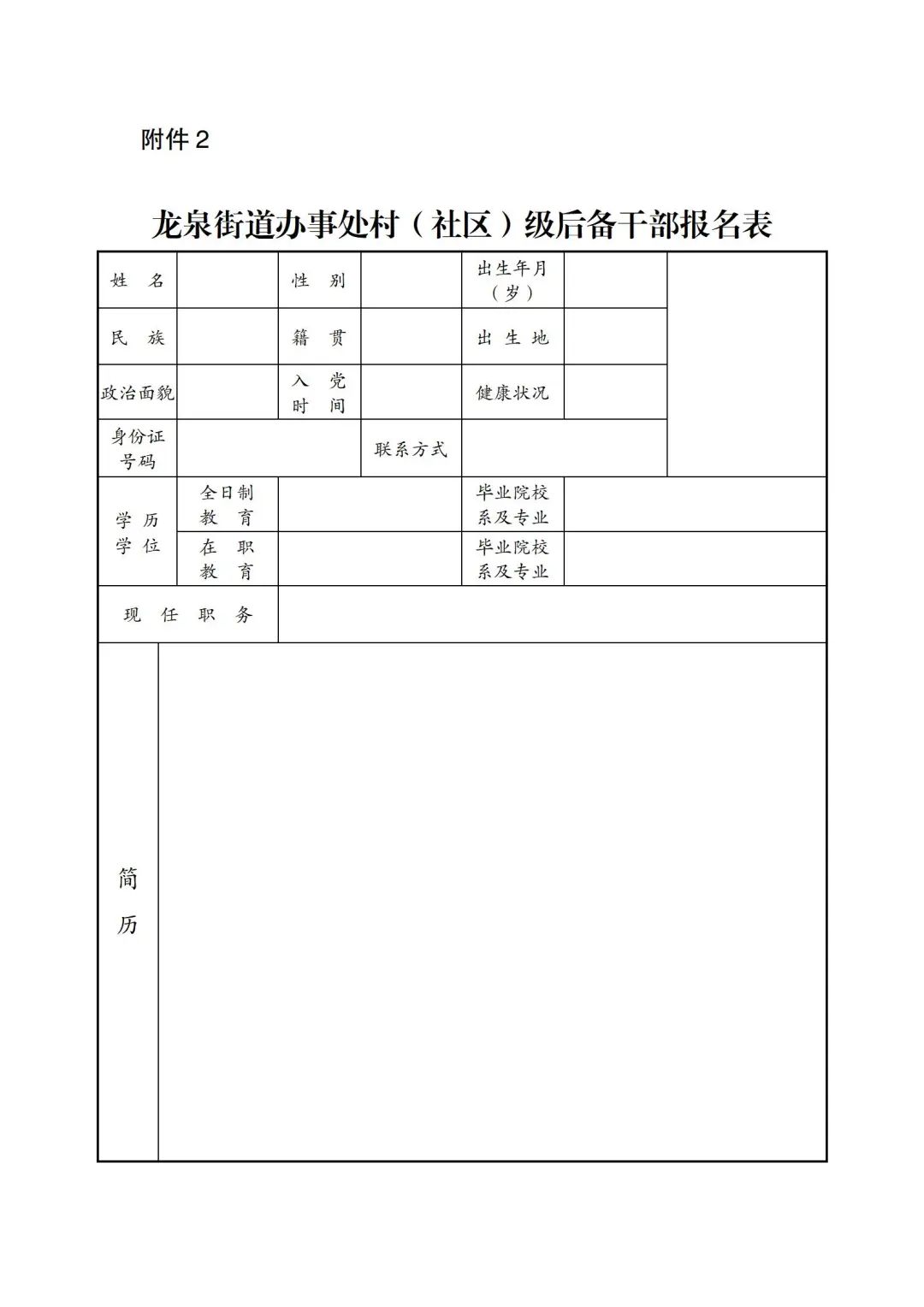 2.龍泉街道辦事處村(社區(qū))級后備干部報名表