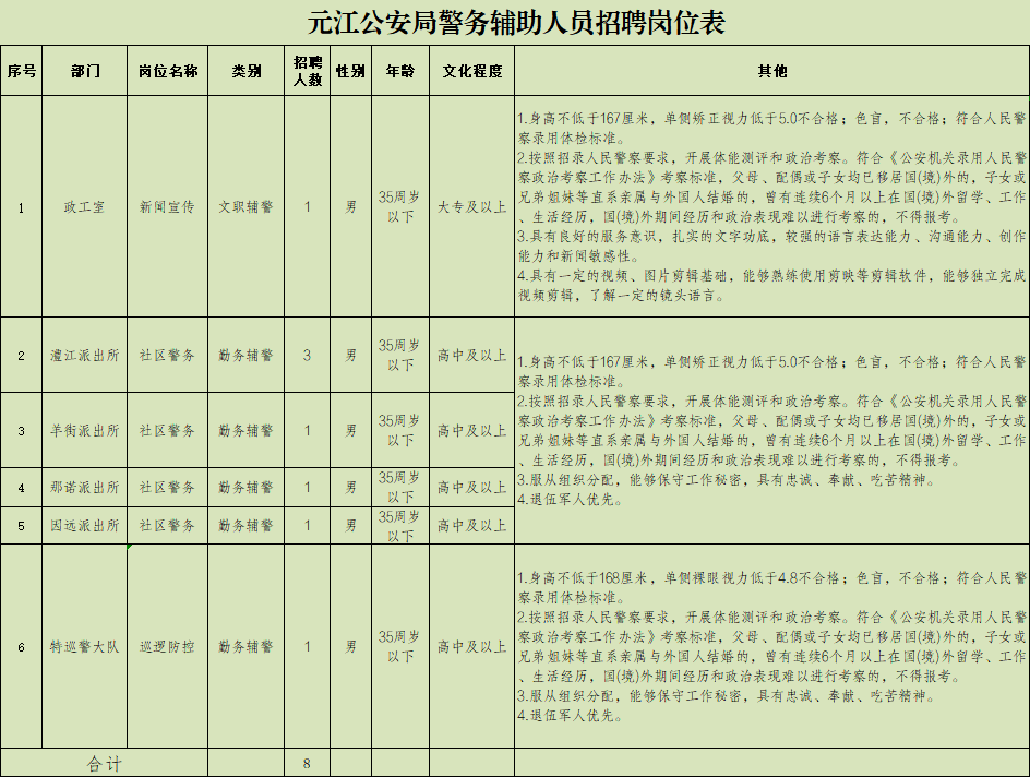 根據(jù)工作需要,按照《云南省公安機(jī)關(guān)警務(wù)輔助人員管理?xiàng)l例》等有關(guān)規(guī)定,元江縣公安局決定面向社會(huì)公開招聘文職輔警和勤務(wù)輔警(具體崗位及人數(shù)情況詳見附件),現(xiàn)將有關(guān)事項(xiàng)公告如下: