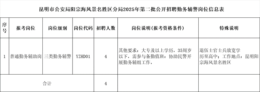 本次共招聘4人,崗位為“三類(lèi)勤務(wù)輔警”,此崗位男性較為適合,詳見(jiàn)崗位信息表: