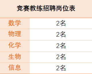 1.在職教練:熟悉競賽輔導工作,能獨立擔任相關學科競賽教學工作,有指導學生獲得相關學科競賽一等獎的工作經(jīng)歷,有作為主教練指導學生入選相關學科冬(夏)令營并獲得金銀銅牌的經(jīng)歷最佳。