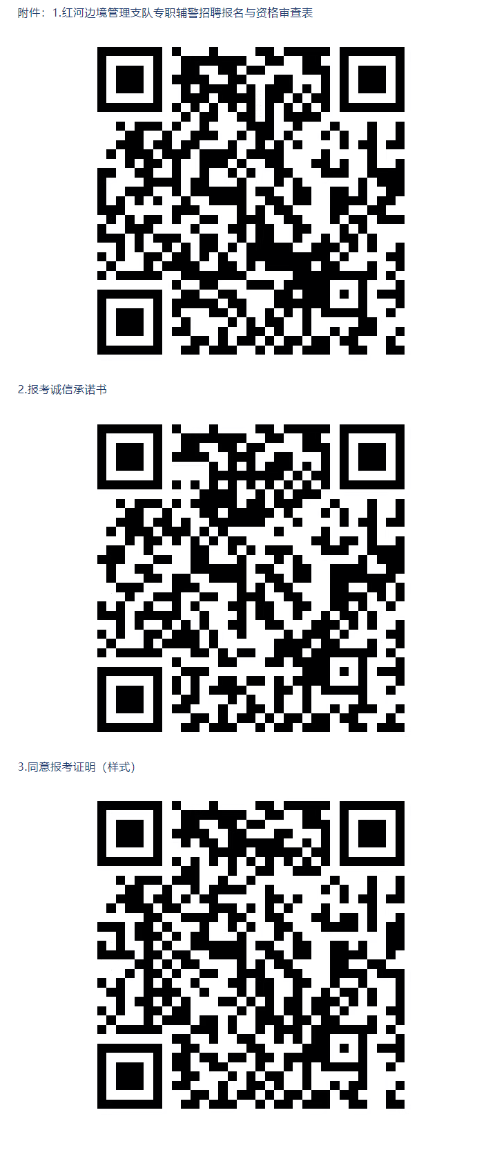 (2)報(bào)名時(shí)需提交《紅河邊境管理支隊(duì)專職輔警招聘報(bào)名與資格審查表》(見附件1,粘貼近期免冠半寸彩色照片)一式一份,攜帶本人身份證、戶口本、畢業(yè)證、征信報(bào)告、報(bào)考誠信承諾書(見附件2)、單位同意報(bào)考證明(見附件3,無工作單位的不提供)以及優(yōu)先招聘條件所需的其他證明材料原件及復(fù)印件1份。