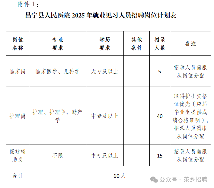 招聘就業(yè)見習崗60人,其中包括:臨床崗5人、護理崗40人、醫(yī)療輔助崗15人。招聘的具體崗位、資格條件等詳見《昌寧縣人民醫(yī)院2025年就業(yè)見習人員招聘崗位計劃表》(附件1)