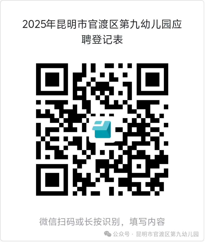 報(bào)名采取網(wǎng)絡(luò)方式進(jìn)行,點(diǎn)擊下面鏈接或掃描二維碼進(jìn)入《2025年官渡區(qū)第九幼兒園應(yīng)聘登記表》網(wǎng)頁(yè)后,如實(shí)填寫個(gè)人相關(guān)信息,上傳應(yīng)聘所需材料進(jìn)行報(bào)名,點(diǎn)擊“提交”后則報(bào)名完成。