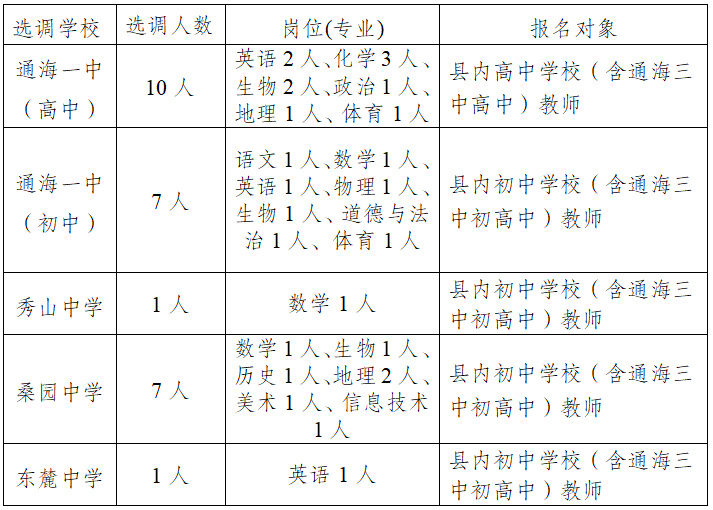 為加強城區(qū)學校教師隊伍建設(shè),結(jié)合通??h教體系統(tǒng)單位實際,按照“公開、公平、競爭、擇優(yōu)”的原則,在本系統(tǒng)內(nèi)公開定向選調(diào)中小學教師,現(xiàn)將選調(diào)工作的有關(guān)情況公告如下: