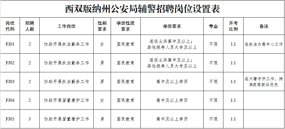 在西雙版納州公安局開展警務輔助工作,輔警不具有人民警察和公務員身份,不行使人民警察職權。本次共招聘11人,詳見《西雙版納州公安局輔警招聘崗位設置表》(附件1)。