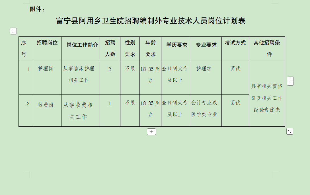 此次招聘編制外工作人員3名,具體崗位、人數(shù)、資格條件等詳見附件《富寧縣阿用鄉(xiāng)衛(wèi)生院招聘編制外專業(yè)技術(shù)人員崗位計(jì)劃表》