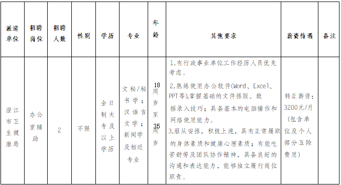 澄江市衛(wèi)生健康局因工作需要,委托澄江市啟澄人力資源有限責(zé)任公司,面向社會(huì)公開招聘行政輔助工作人員2名, 現(xiàn)將有關(guān)事項(xiàng)公告如下:
