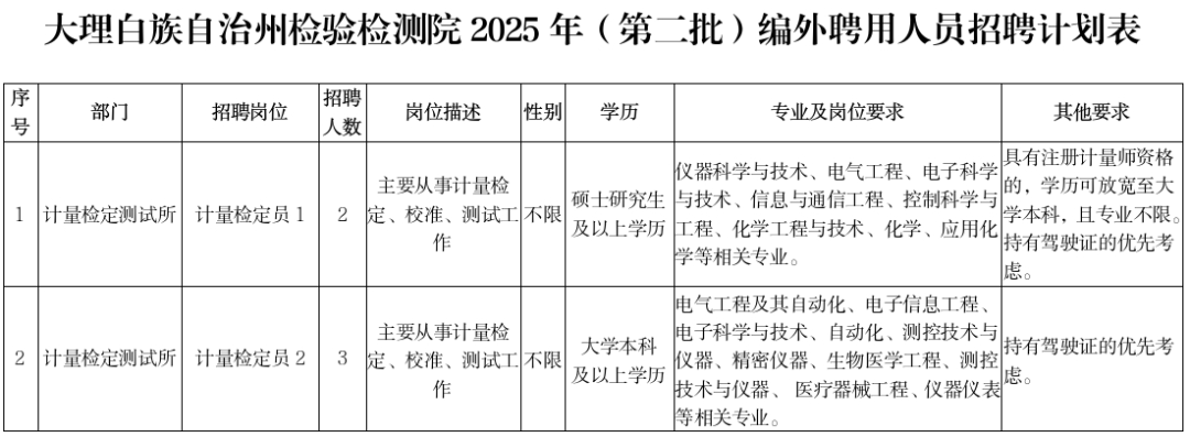 招聘崗位及招聘條件詳見《大理白族自治州檢驗檢測院2025年(第二批)編外聘用人員招聘計劃表》(詳見附件1)。