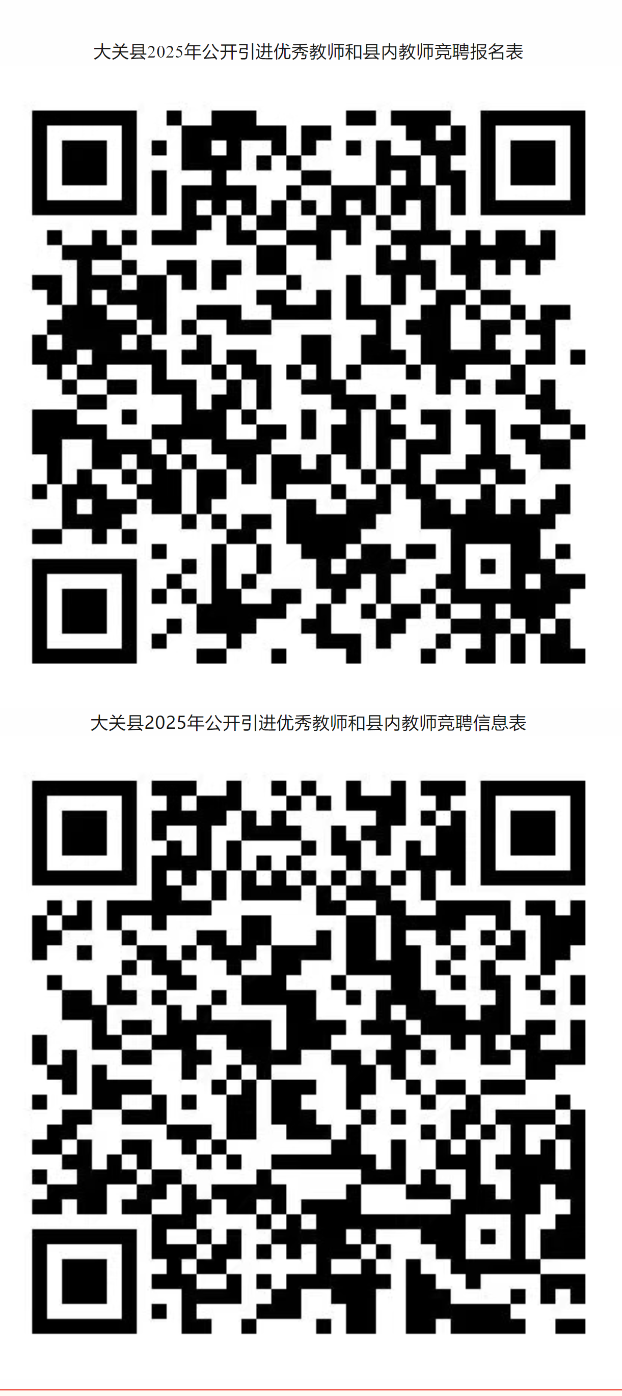 (1)大關(guān)縣2025年公開引進(jìn)優(yōu)秀教師和縣內(nèi)教師競聘上崗報(bào)名表(附件2,雙面打印,貼近期免冠小一寸彩色相片,縣外人員須有報(bào)名者所在縣級(jí)教育主管部門和人力資源和社會(huì)保障局同意報(bào)考的簽章,縣內(nèi)人員須有報(bào)名者所在學(xué)校同意報(bào)考的簽章)。