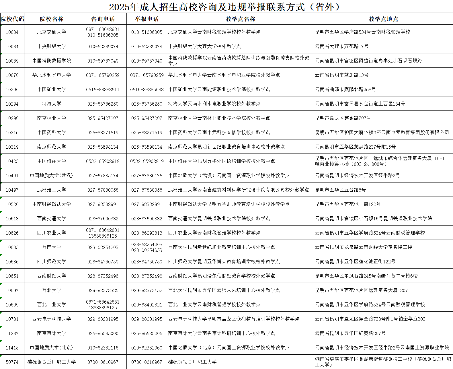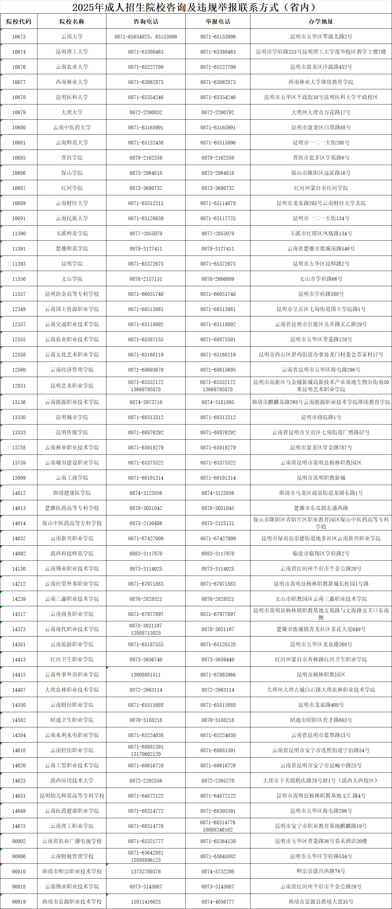 1.2025年云南省成人高考報名點及聯(lián)系電話