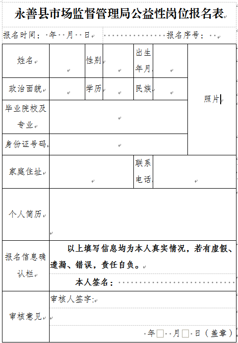 公益性崗位報(bào)名表請(qǐng)點(diǎn)擊下載:永善縣市場監(jiān)督管理局公益性崗位報(bào)名表.docx