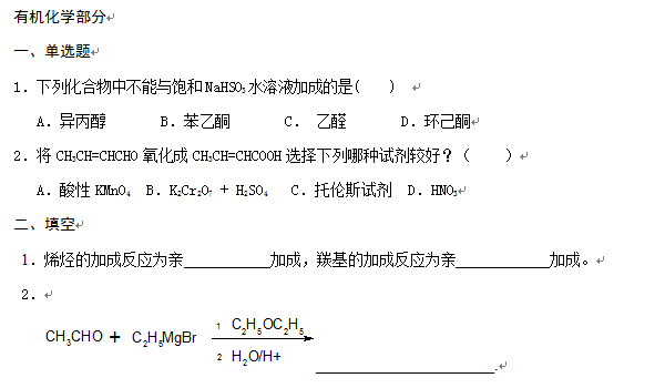 11.醛和酮:掌握碳氧雙鍵和碳碳雙鍵的結構差異及在加成反應方面的異同;熟練掌握醛、酮的化學性質,重點是親核加成反應,理解其反應歷程;掌握醛、酮在化學性質上的差異,如氧化還原反應及歧化反應;掌握醛酮的鑒別方法。