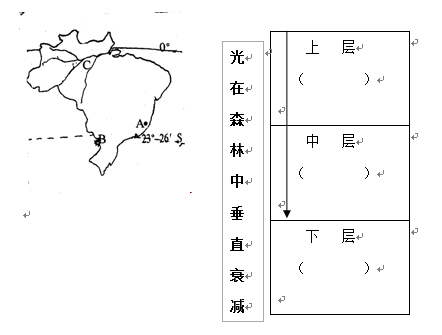 (3)在我國云南西雙版納地區(qū),人們運(yùn)用的原理,模擬C地的雨林結(jié)構(gòu),建立起多層次的人工經(jīng)濟(jì)林,備選植物有:橡膠、咖啡、草果、茶樹。請你在上面未設(shè)計(jì)完的人工經(jīng)濟(jì)林模擬圖中的括號(hào)內(nèi)填入備選植物名稱。