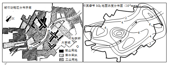 讀某城市功能區(qū)分布圖與該城市某季節(jié)地面SO2濃度分布圖,回答9—11題。