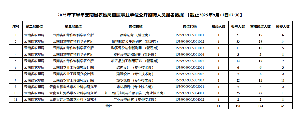 現(xiàn)將2025年下半年云南省農(nóng)墾局直屬事業(yè)單位公開(kāi)招聘人員報(bào)名數(shù)據(jù)【截止2025年9月11日17:30】公布如下: