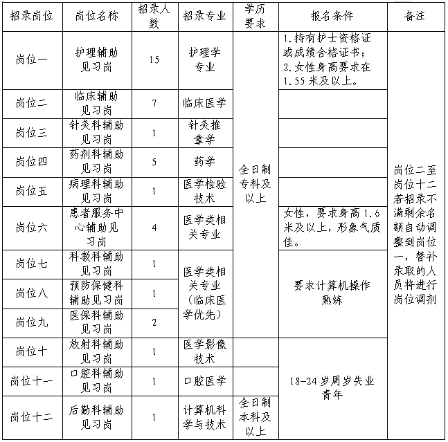 為響應(yīng)黨和國家的號召,加強對高校畢業(yè)生的培養(yǎng),盡快提高其工作能力,根據(jù)醫(yī)院工作需要,現(xiàn)擬面向社會公開招錄見習(xí)崗人員40名,現(xiàn)將有關(guān)事宜公告如下: