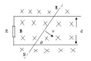 2. 如圖所示,平行導(dǎo)軌間距為d=1m,一端跨接一個電阻R=2Ω。勻強磁場B=0.5T,方向垂直于平行金屬導(dǎo)軌所在平面。一根金屬棒與導(dǎo)軌成Θ=60。角放置,金屬棒與導(dǎo)軌的電阻均不計。當(dāng)金屬棒沿垂直于棒的方向以恒定速度v=4m/s在金屬導(dǎo)軌上滑行時,通過電阻R的電流是多少?