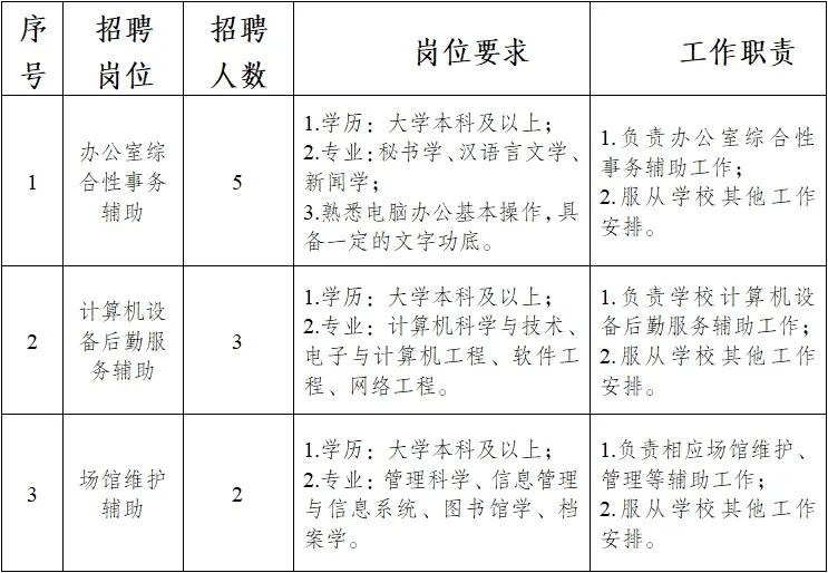 (一)招聘崗位:辦公室綜合性事務(wù)、后勤服務(wù)等輔助性崗位10名。