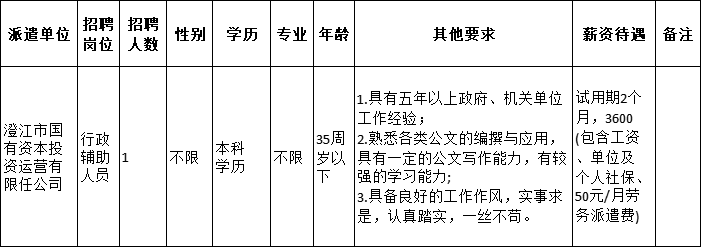 澄江市國有資本投資運營有限責任公司因工作需要,委托澄江市啟澄人力資源有限責任公司面向社會公開招聘行政輔助人員1名,現(xiàn)將有關事項公告如下: