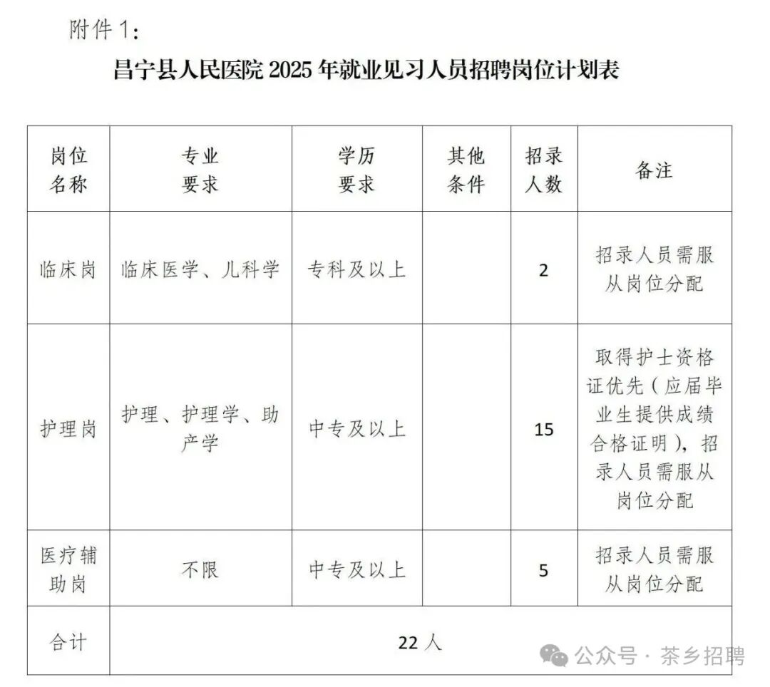 招聘就業(yè)見習(xí)崗22人,其中包括:臨床崗2人、護(hù)理崗15人、醫(yī)療輔助崗5人。招聘的具體崗位、資格條件等詳見《昌寧縣人民醫(yī)院2025年就業(yè)見習(xí)人員招聘崗位計(jì)劃表》(附件1)