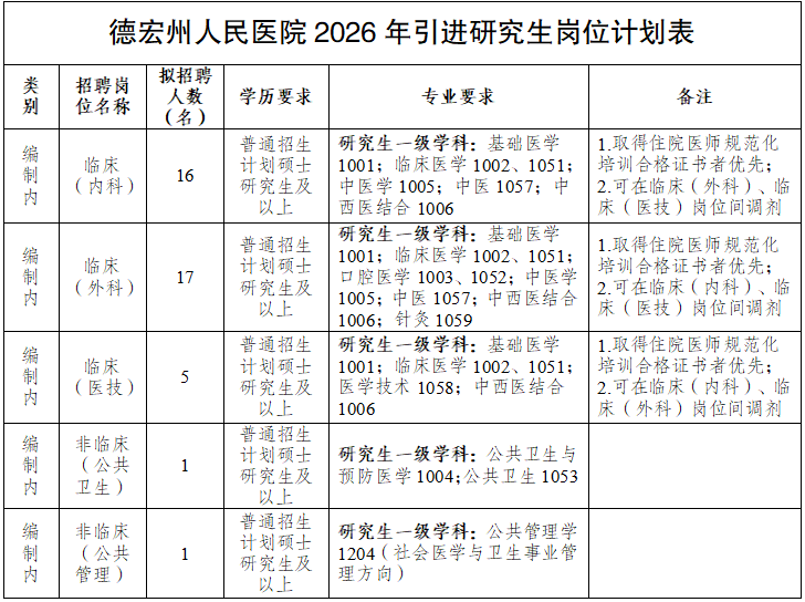 德宏州人民醫(yī)院2026年公開引進研究生公告