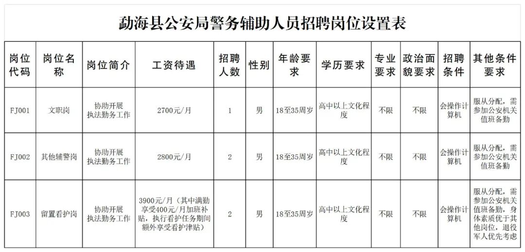 本次共招聘輔警5人,主要在勐海縣公安局內(nèi)設(shè)機(jī)構(gòu)從事執(zhí)法勤務(wù)等工作。輔警不具有人民警察和公務(wù)員身份,不行使人民警察職權(quán)。具體崗位見(jiàn)《勐海縣公安局警務(wù)輔助人員招聘崗位設(shè)置表》