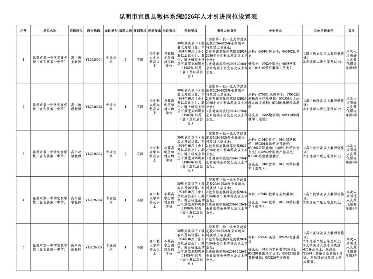 昆明市第一中學(xué)宜良學(xué)校2026年人才引進崗位設(shè)置表