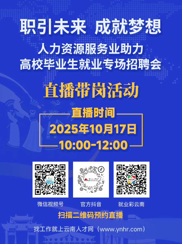 10月17日10:00——12:00通過云南人才市場微信公眾號(視頻號)、抖音、就業(yè)彩云南(視頻號)將同步開展直播送崗活動,介紹本場招聘會情況、參會單位、招聘崗位、薪酬福利等。