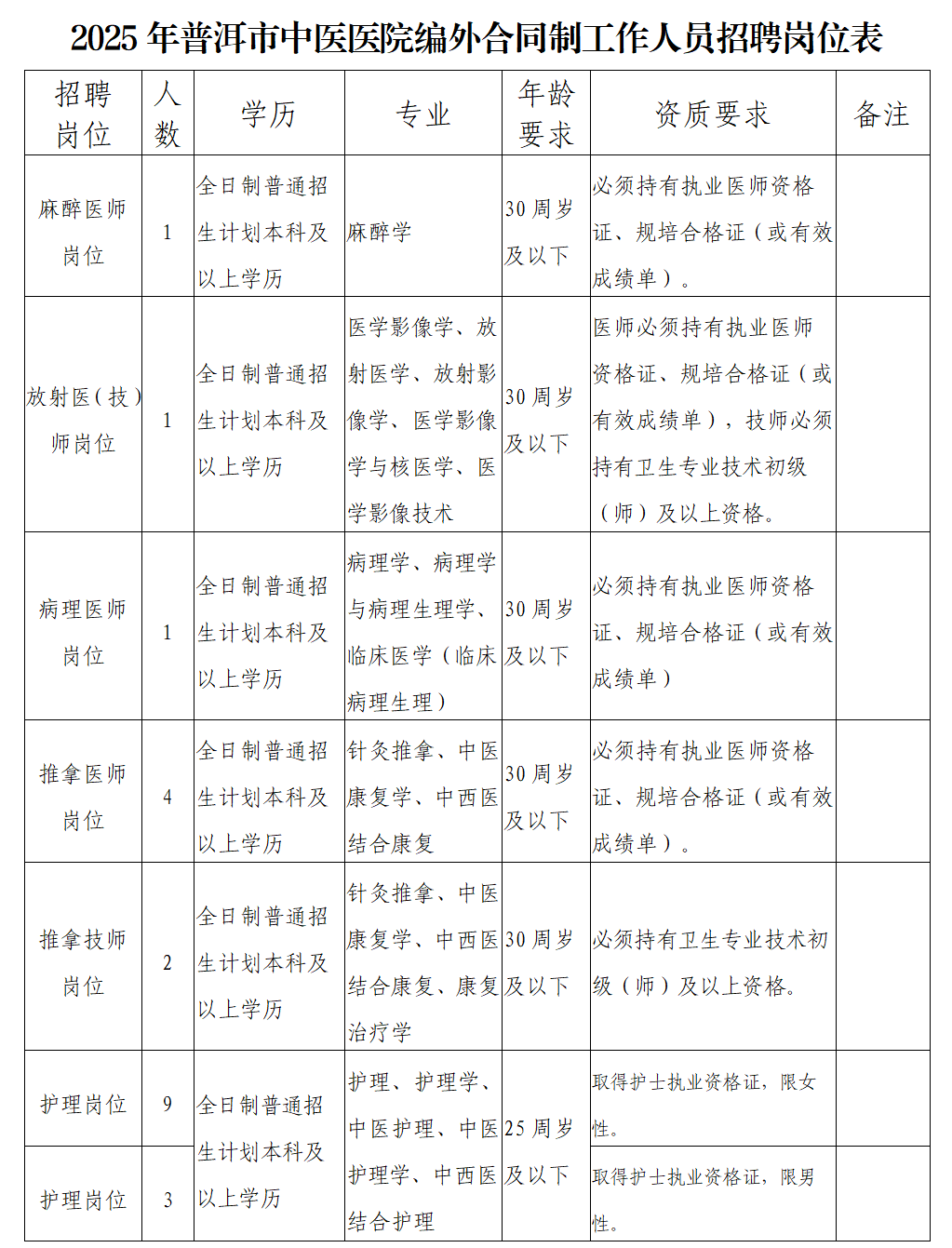 普洱市中醫(yī)醫(yī)院2025年公開招聘編外合同制工作人員公告