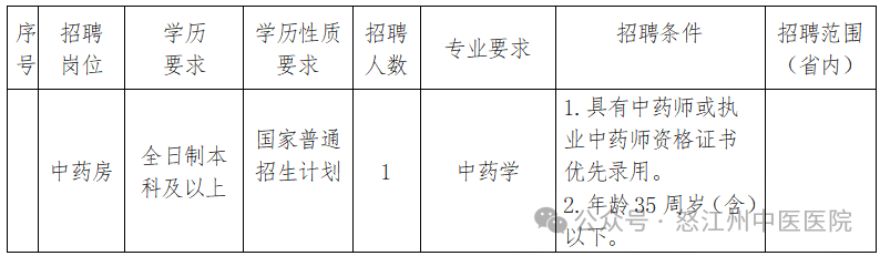 中藥房崗位:全日制本科及以上學歷,取得畢業(yè)證書、學位證(具有中藥師或執(zhí)業(yè)中藥師資格證書優(yōu)先錄用)。
