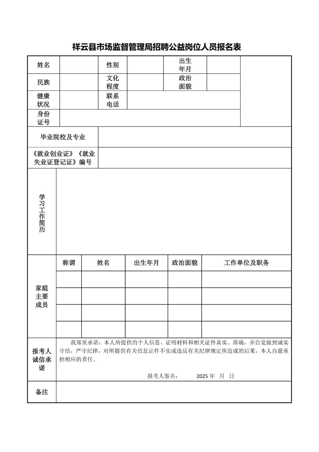 附件:祥云縣市場(chǎng)監(jiān)督管理局招聘公益性崗位人員報(bào)名表
