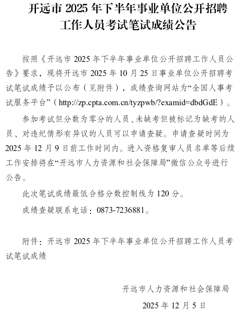 附件:開(kāi)遠(yuǎn)市2025年下半年事業(yè)單位公開(kāi)招聘 工作人員考試筆試成績(jī)公告