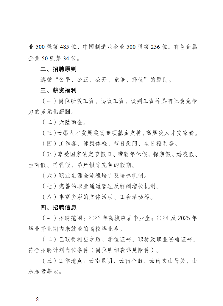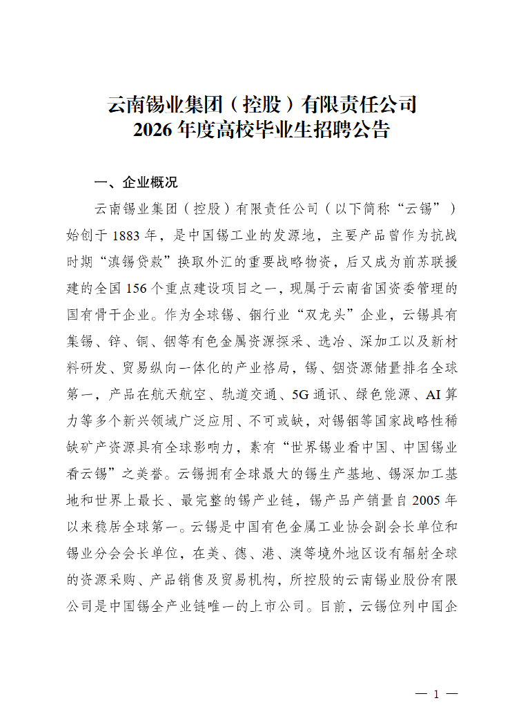 附件【附件:云南錫業(yè)集團(控股)有限責任公司2026年高校畢業(yè)生招聘計劃崗位明細表.pdf】