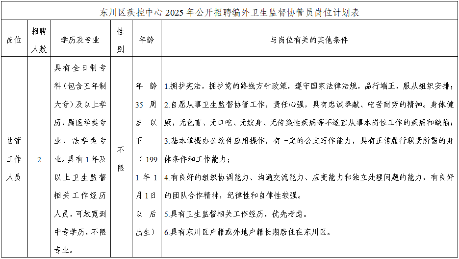 附件1:東川區(qū)疾控中心2025年公開招聘編外衛(wèi)生監(jiān)督協(xié)管員崗位計(jì)劃表.docx